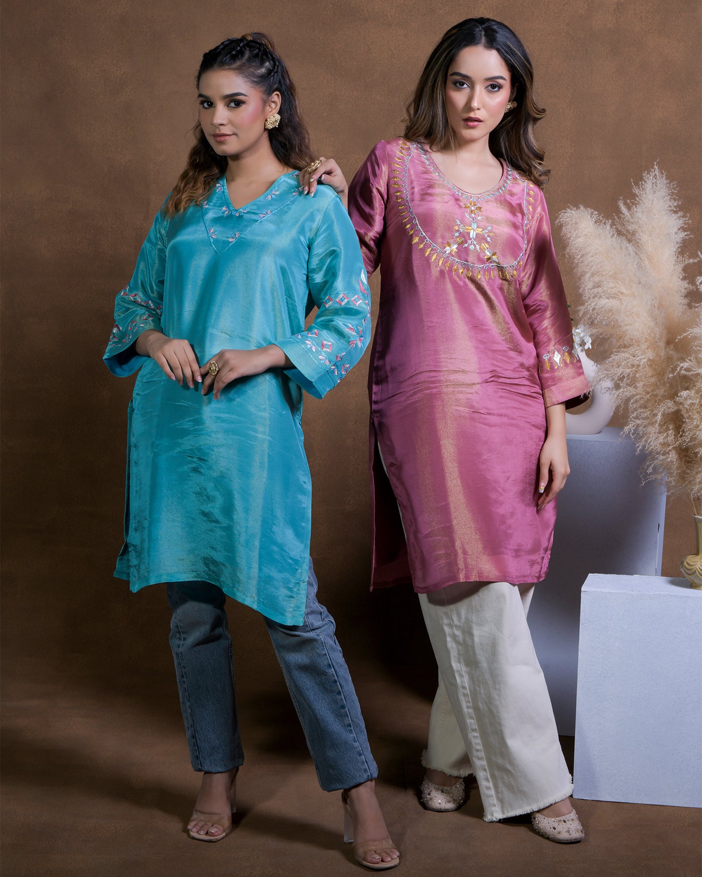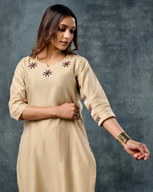 Exclusive OffersPure Cotton Silk Hand Work Phulkari Kurti Pant - Hazelnut