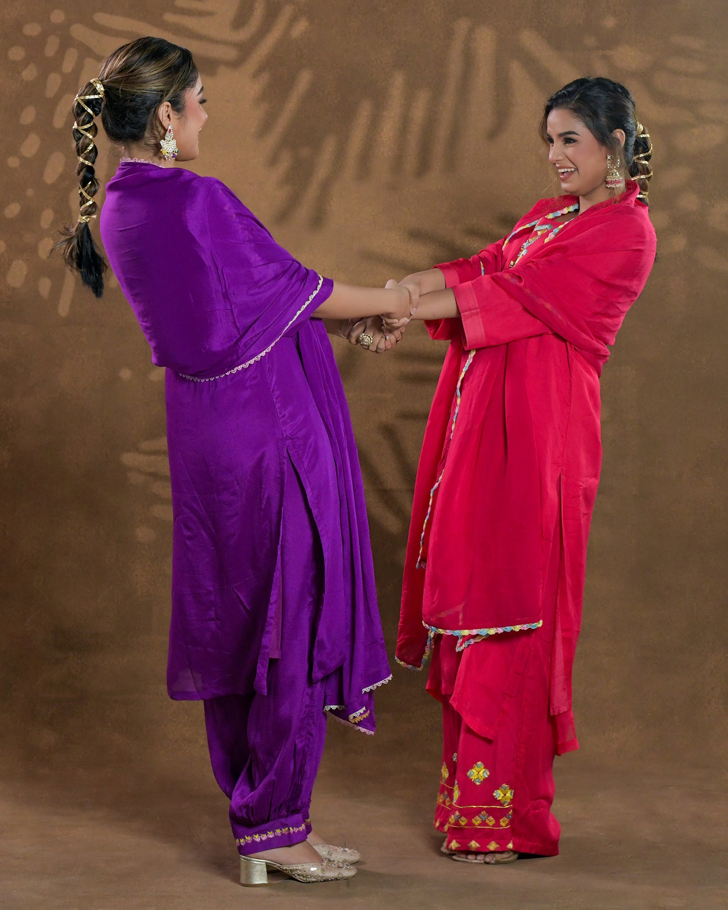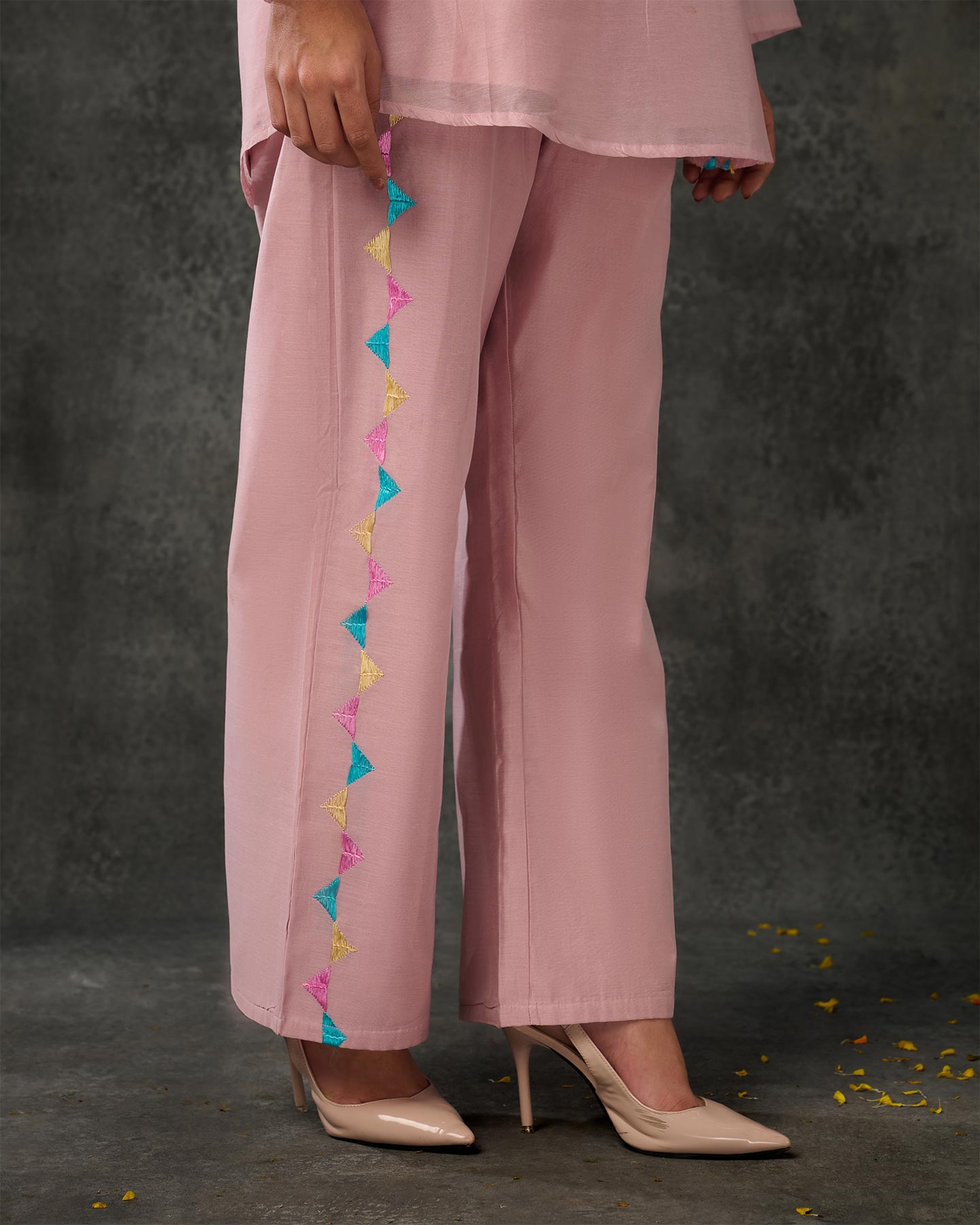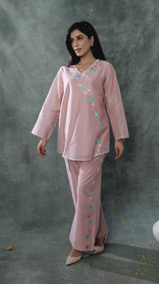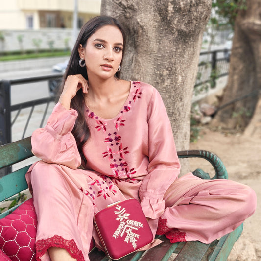 Exclusive OffersPure Cotton Silk Hand Work Phulkari Coord Set - Mauve Pink