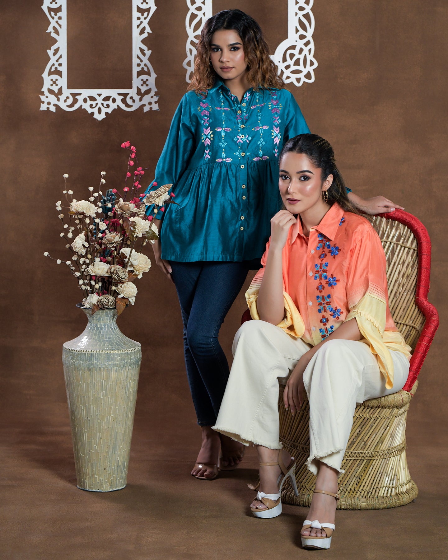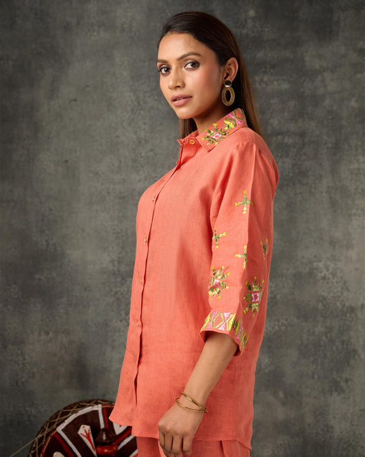 Exclusive OffersPure Linen Hand Work Phulkari Shirt - Coral Orange
