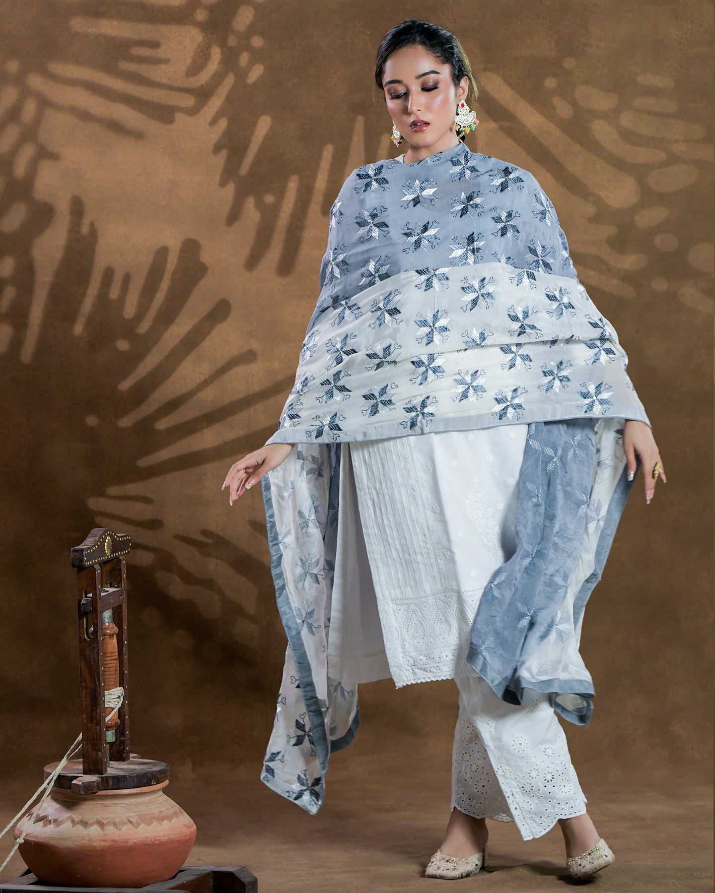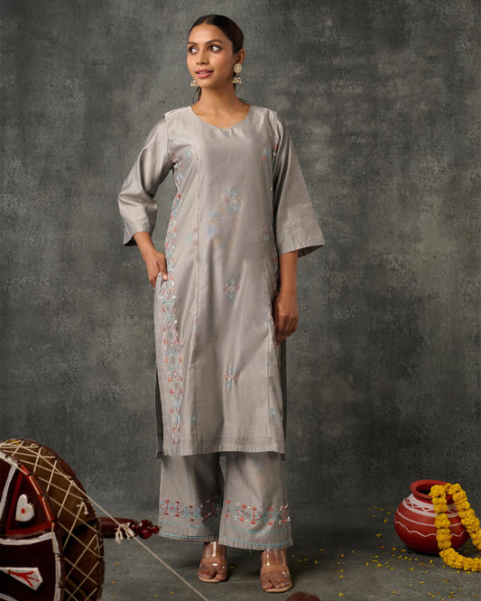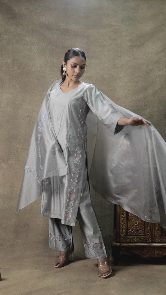 Exclusive OffersPure Cotton Silk Hand Work Phulkari Suit with Dupatta - Glacier Grey