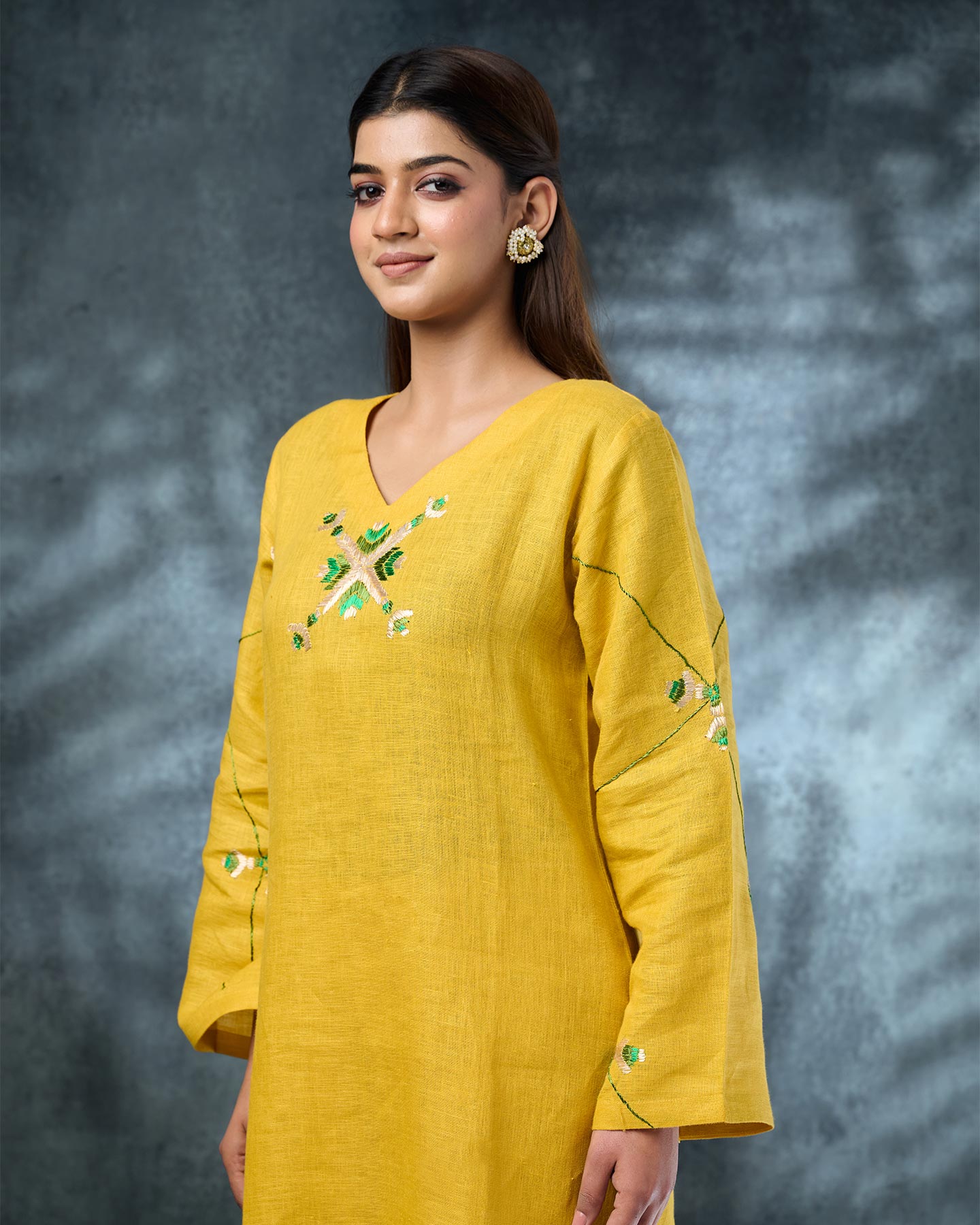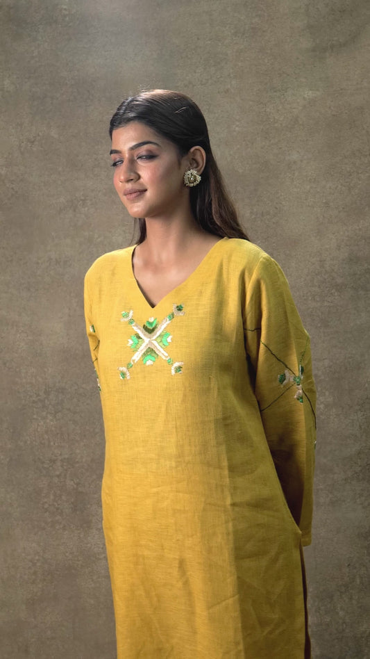 Pure Linen Hand Work Phulkari Kurti Pant - Sunflower Yellow
