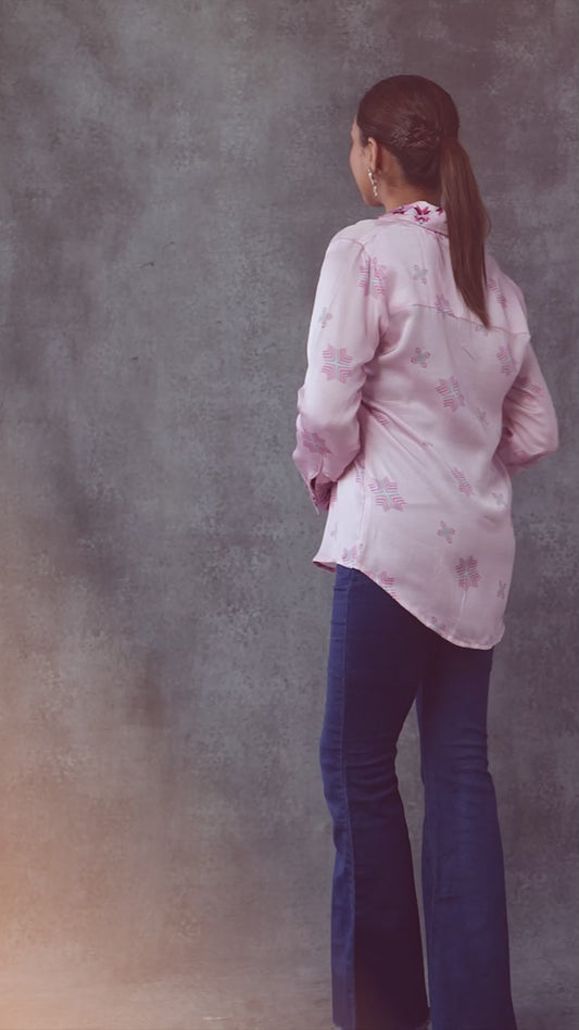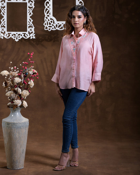 Pure Silk Fusion Print and Hand Work Phulkari Shirt - Blush Pink