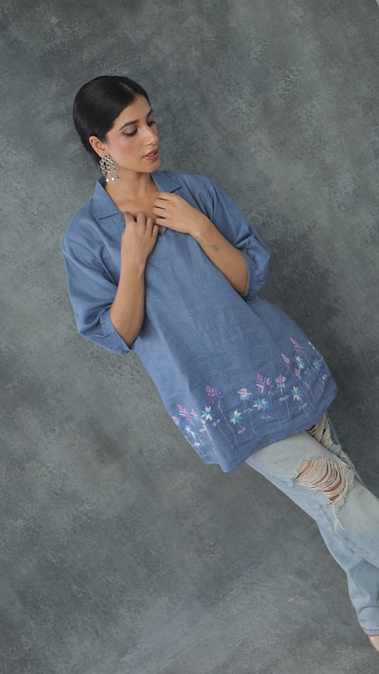 Pure Linen Hand work Phulkari Tunic - Baby Blue