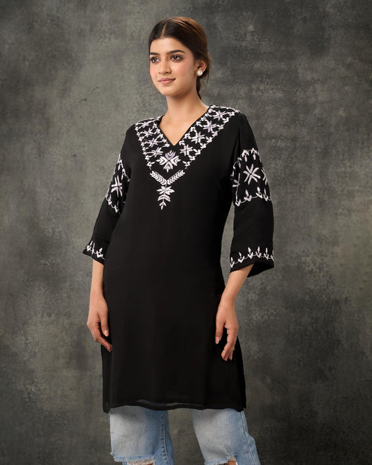 Pure Georgette Hand work Phulkari Short Kurti - Black