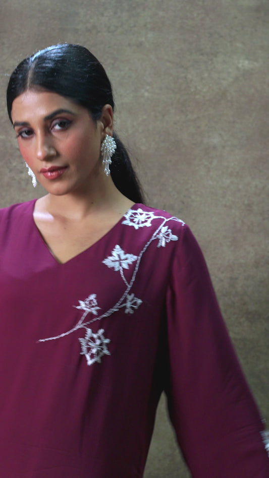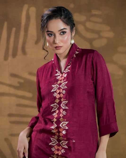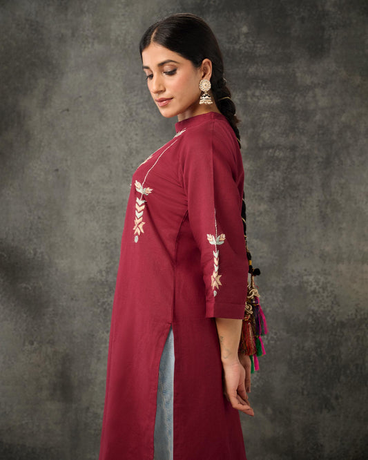 Pure Cotton Linen Hand Work Phulkari Kurti - Aesthetic Maroon