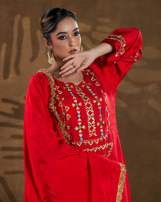 Pure Cotton Silk Hand Work Phulkari Suit with Dupatta - Heritage Red