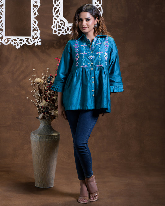 Exclusive OffersPure Cotton Silk Hand Work Phulkari Shirt - Teal Blue