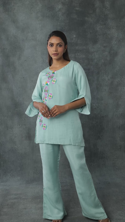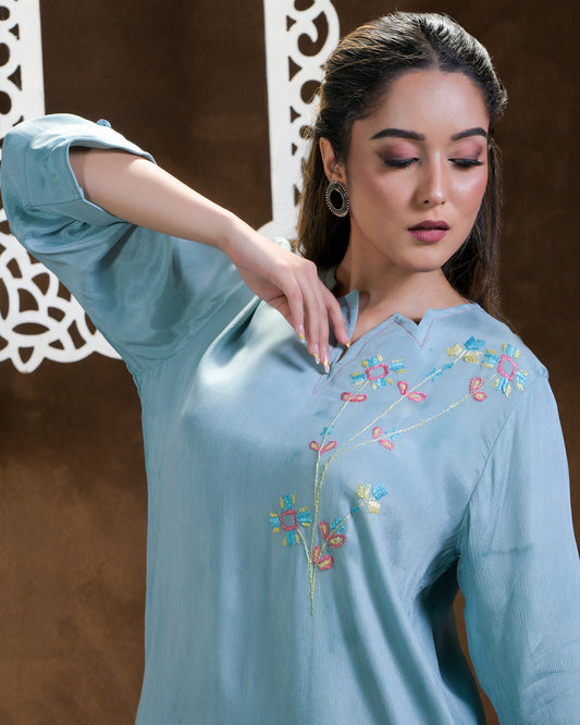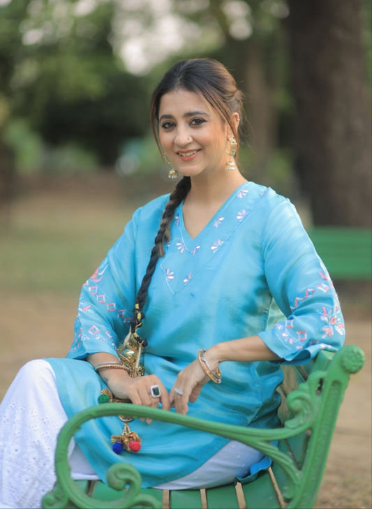Exclusive OffersPure Cotton Muslin Hand Work Phulkari Kurti Pant - Aqua Blue