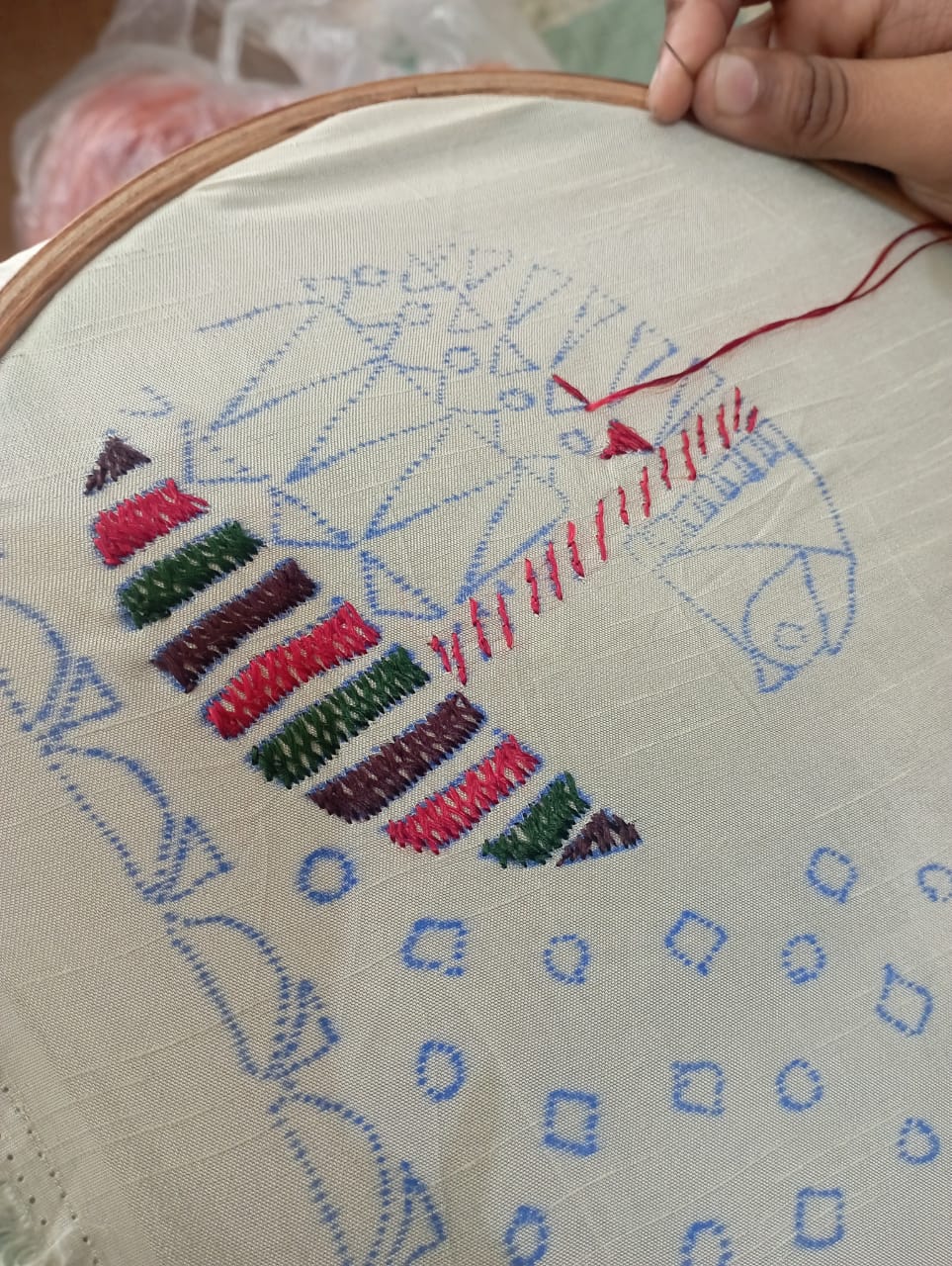 Design is copied on the cloth using neel