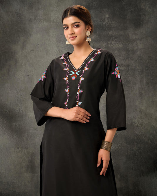Exclusive OffersPure Cotton Silk Hand Work Phulkari Kurti - Black