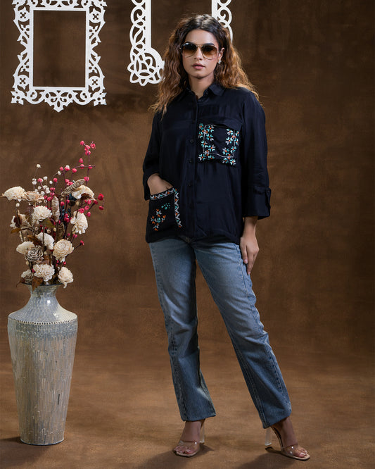 Exclusive OffersPure Muslin Hand Work Phulkari Shirt - Black