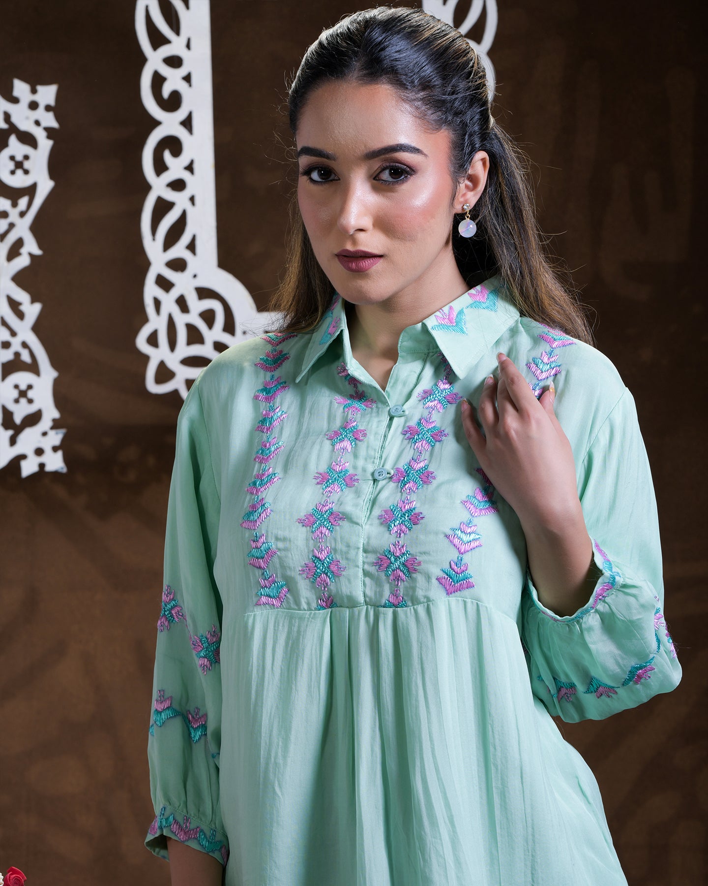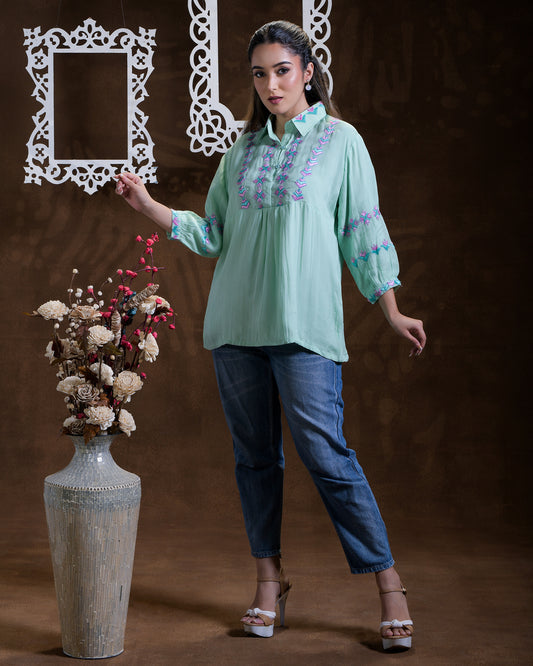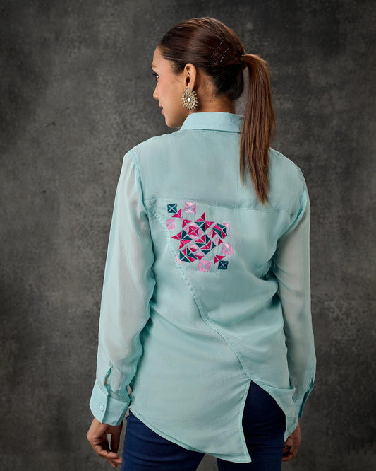 Exclusive OffersPure Organza Hand Work Phulkari Shirt style top - Aqua Green