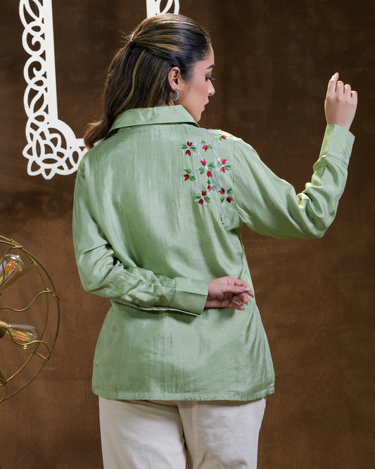 Exclusive OffersPure Cotton Silk Hand Work Phulkari Shirt - Leaf Green