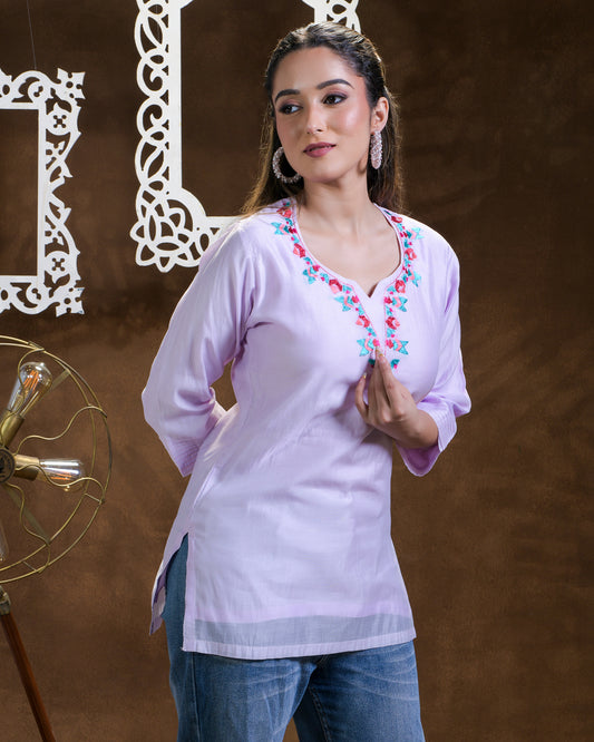 Exclusive OffersPure Cotton Silk Hand Work Phulkari Tunic - Lovely Lavendar