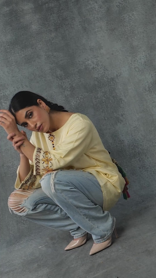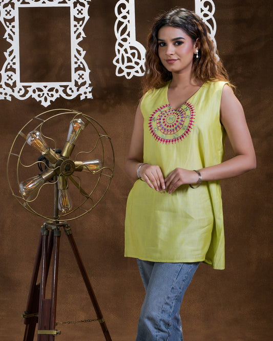 Exclusive OffersPure Cotton Silk Hand Work Phulkari Tunic - Pastel Yellow