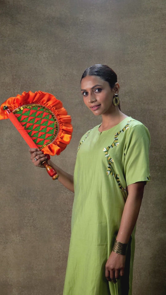 Pure Linen Hand Work Phulkari Kurti Pant Set - Pista Noor Green