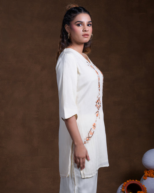 Pure Silk Hand Work Phulkari Shirt - Signature White