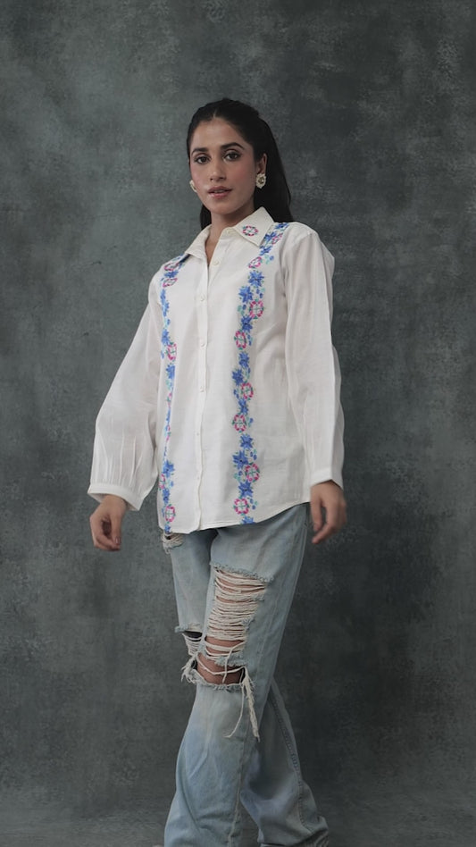 Exclusive OffersPure Cotton Silk Hand Work Phulkari Shirt - Ivory White