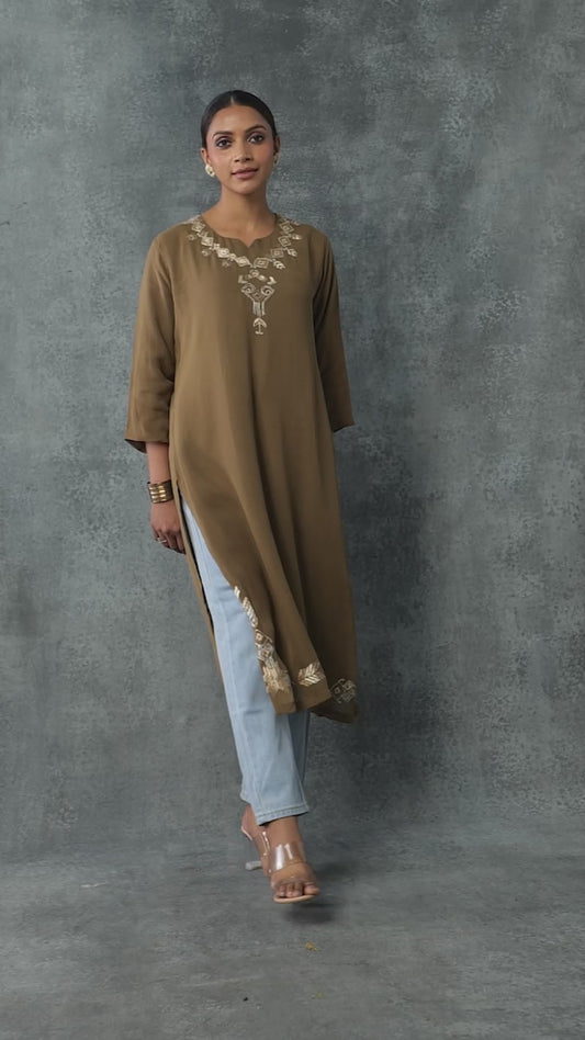 Exclusive OffersPure Georgette Hand Work Phulkari Kurti - Khaki Brown