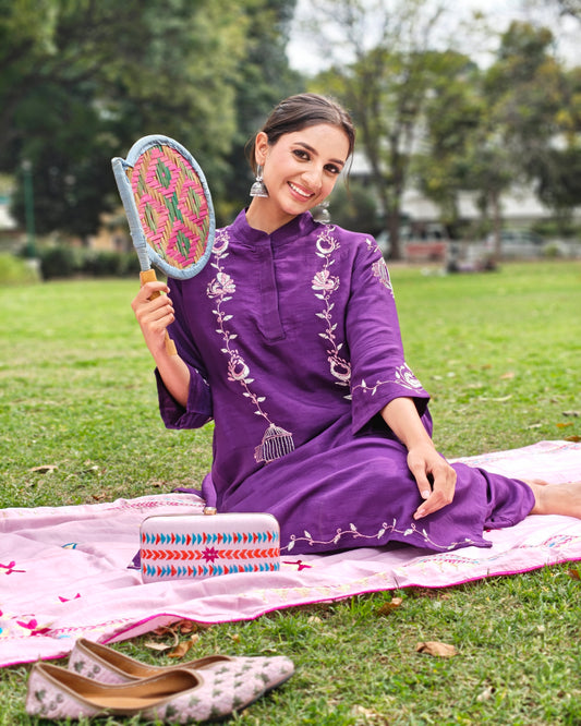 Pure Silk Hand Work Phulkari Kurti Pant Set - Purple Grace