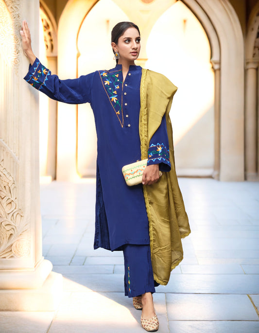 Pure Crepe Hand Work Phulkari Suit with dupatta - Heritage Navy Blue