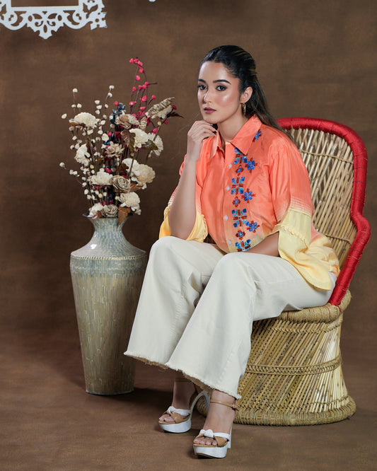 Exclusive OffersPure Muslin Hand Work Phulkari Shirt - Ombre Peach