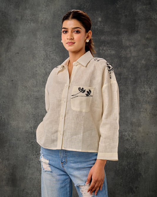 Pure Linen Hand Work Phulkari Loose fit Shirt - Pearl Monochrome