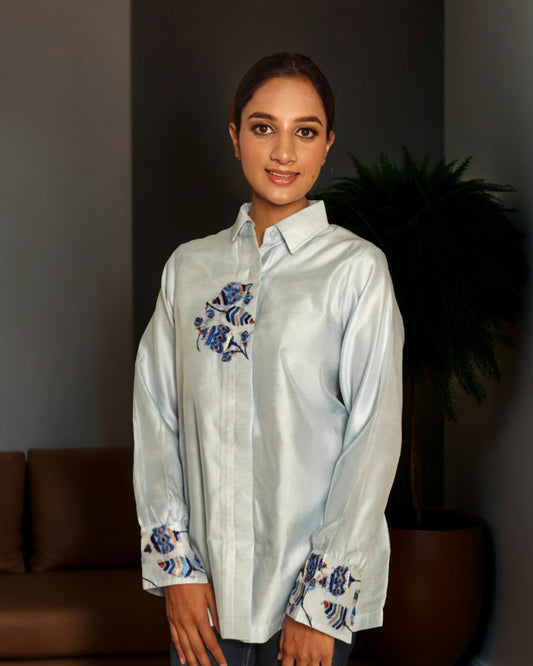 Pure Cotton Silk Hand Work Phulkari Shirt - Blue Muse