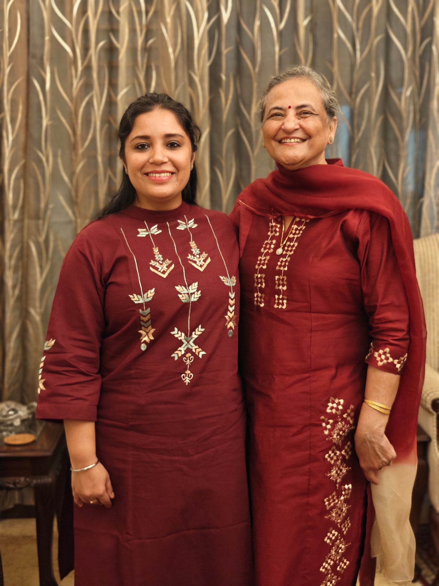 Bindu Chawla, the mother-in-law , is MSc Honours and has been a proud homemaker throughout. Inspired by her daughter-in-law's energy and her own experience in women apparel, childhood knowledge of Phulkari and understanding of trends, she decided to join forces and help her with the venture. She also collaborates with her to create an impact for the betterment of our women artisans.