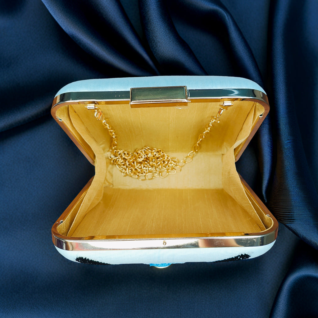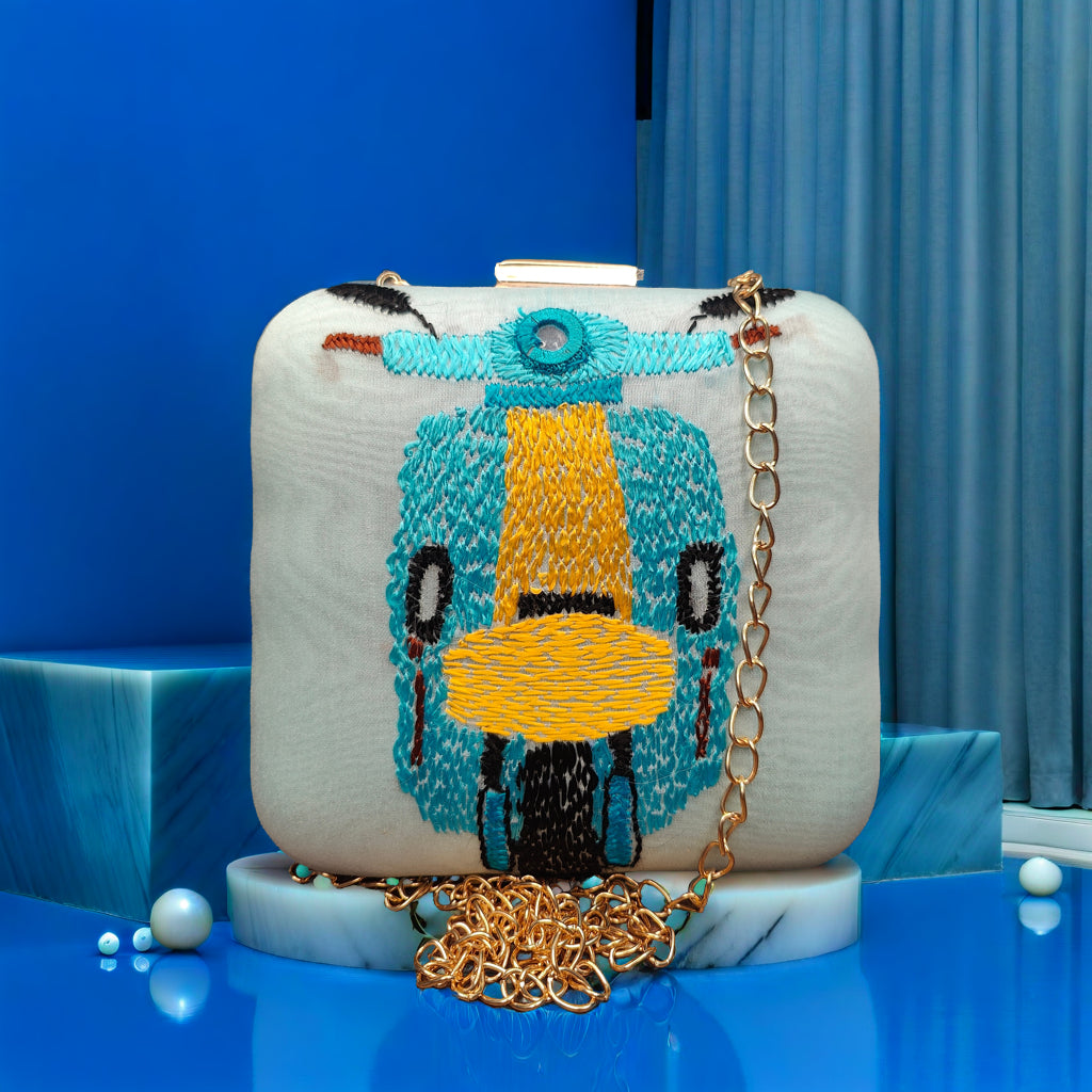 This isn't just a clutch bag; it's a nostalgic journey crafted in silk. This light blue square clutch is a modern tribute to heritage, featuring exquisite Phulkari embroidery. The premium silk fabric provides the perfect canvas for the intricate handwork, where skilled artisans have meticulously stitched a charming scooter motif using vibrant silk threads. This design is a playful yet elegant blend of tradition and contemporary style, making it a unique and sophisticated accessory that tells a story. The meticulous craftsmanship transforms a simple accessory into a wearable piece of art, a vibrant detail that will turn heads and spark conversations. This clutch is the perfect companion for a woman who appreciates the beauty of both classic craftsmanship and modern-day charm.