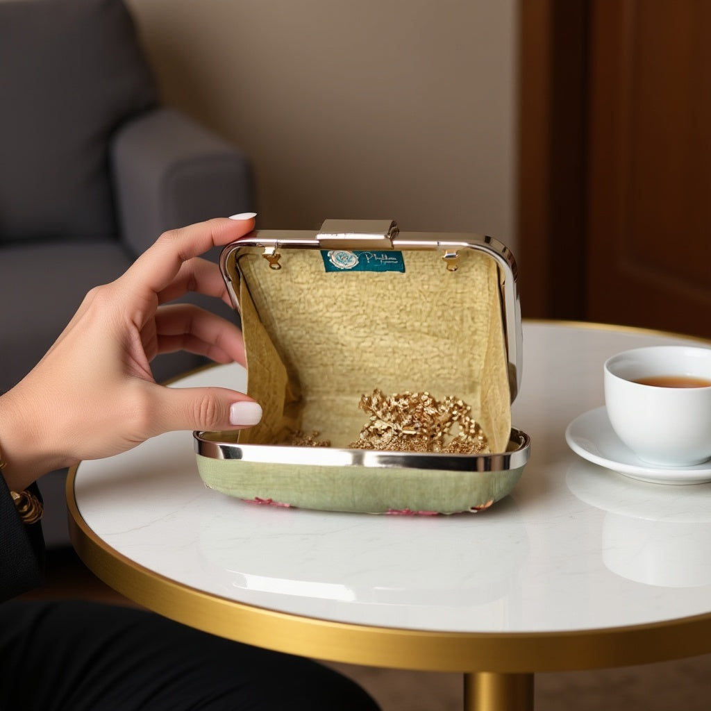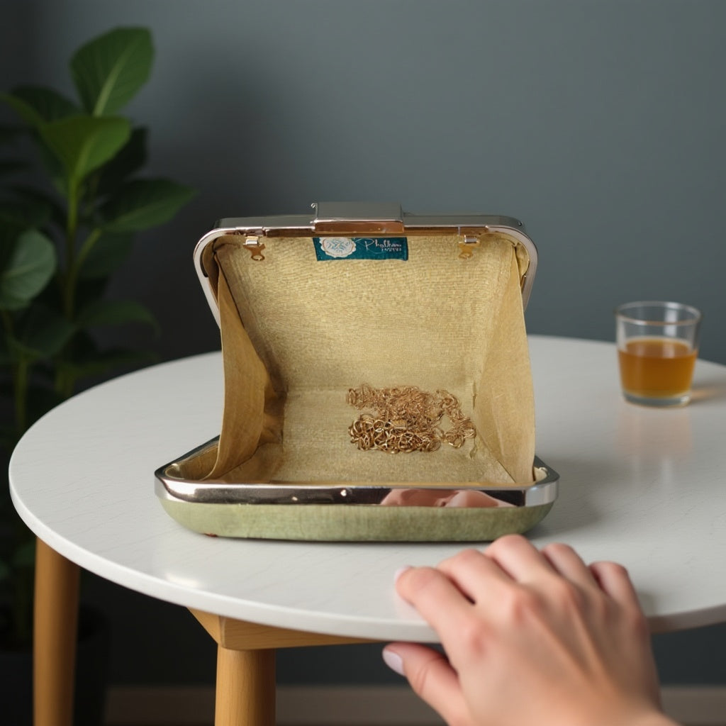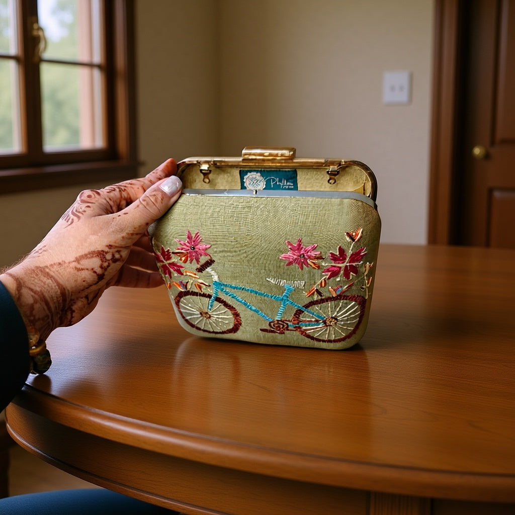This clutch is crafted from pure light green silk — a colour that feels fresh, soft, and full of life. On it, a charming bicycle made of flowers is hand embroidered in bright, delicate Phulkari stitches.