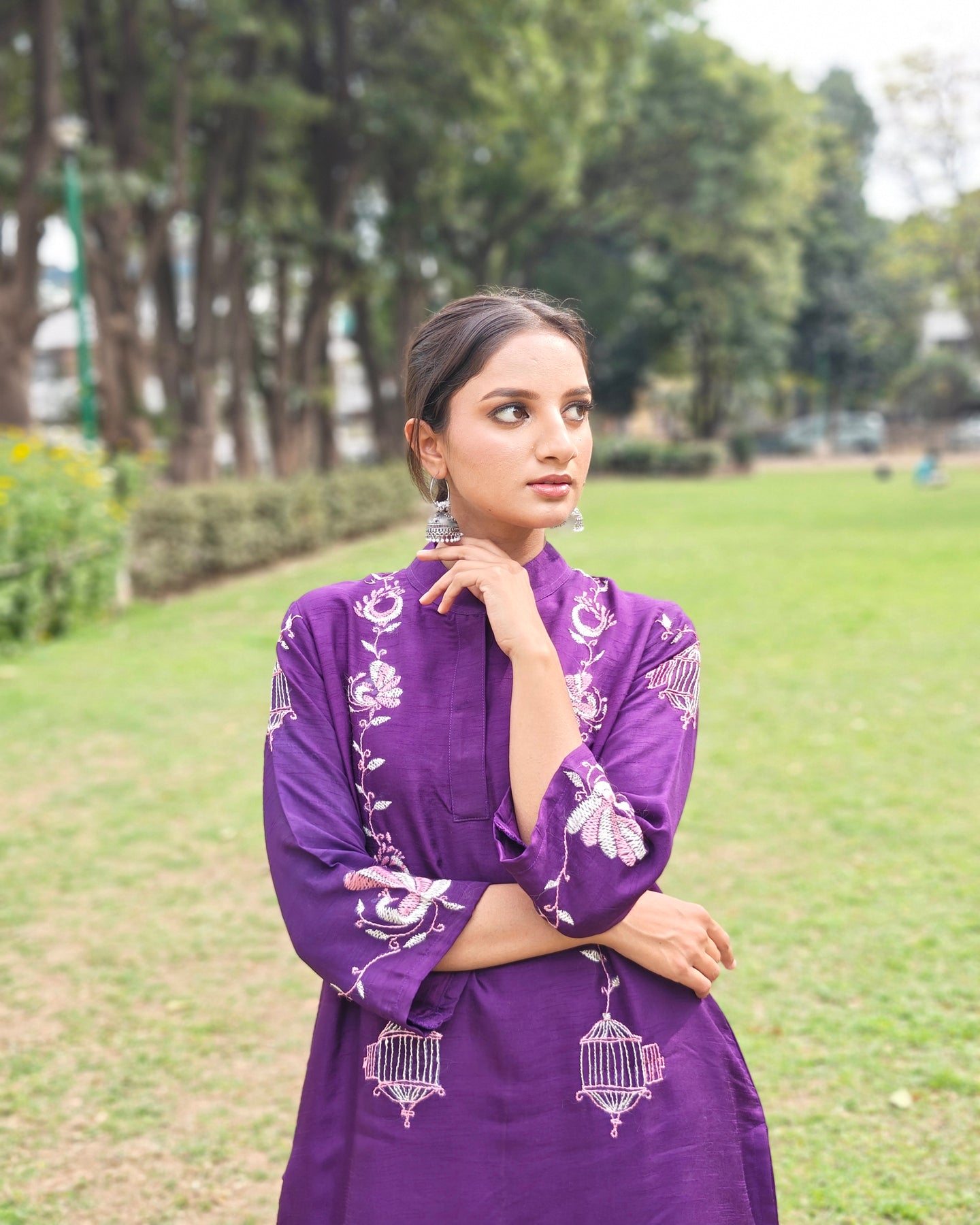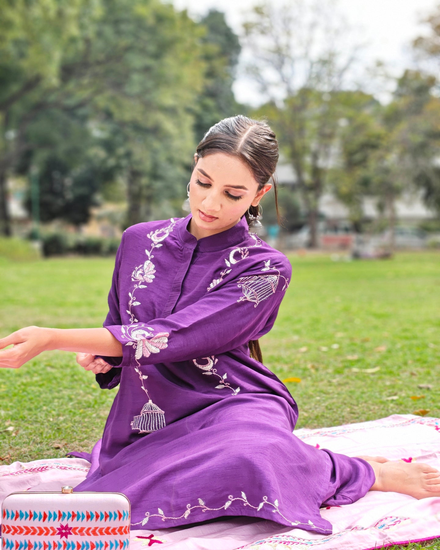 Pure Silk Hand Work Phulkari Kurta - Purple Grace