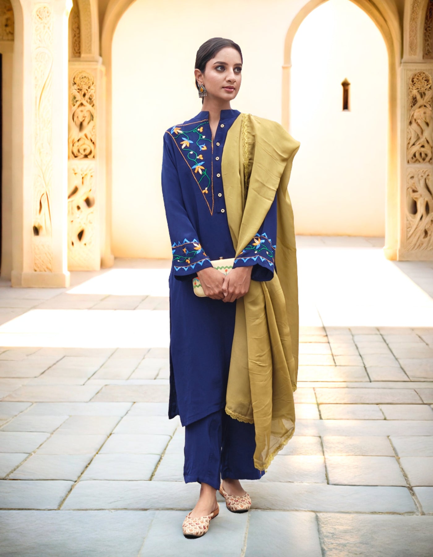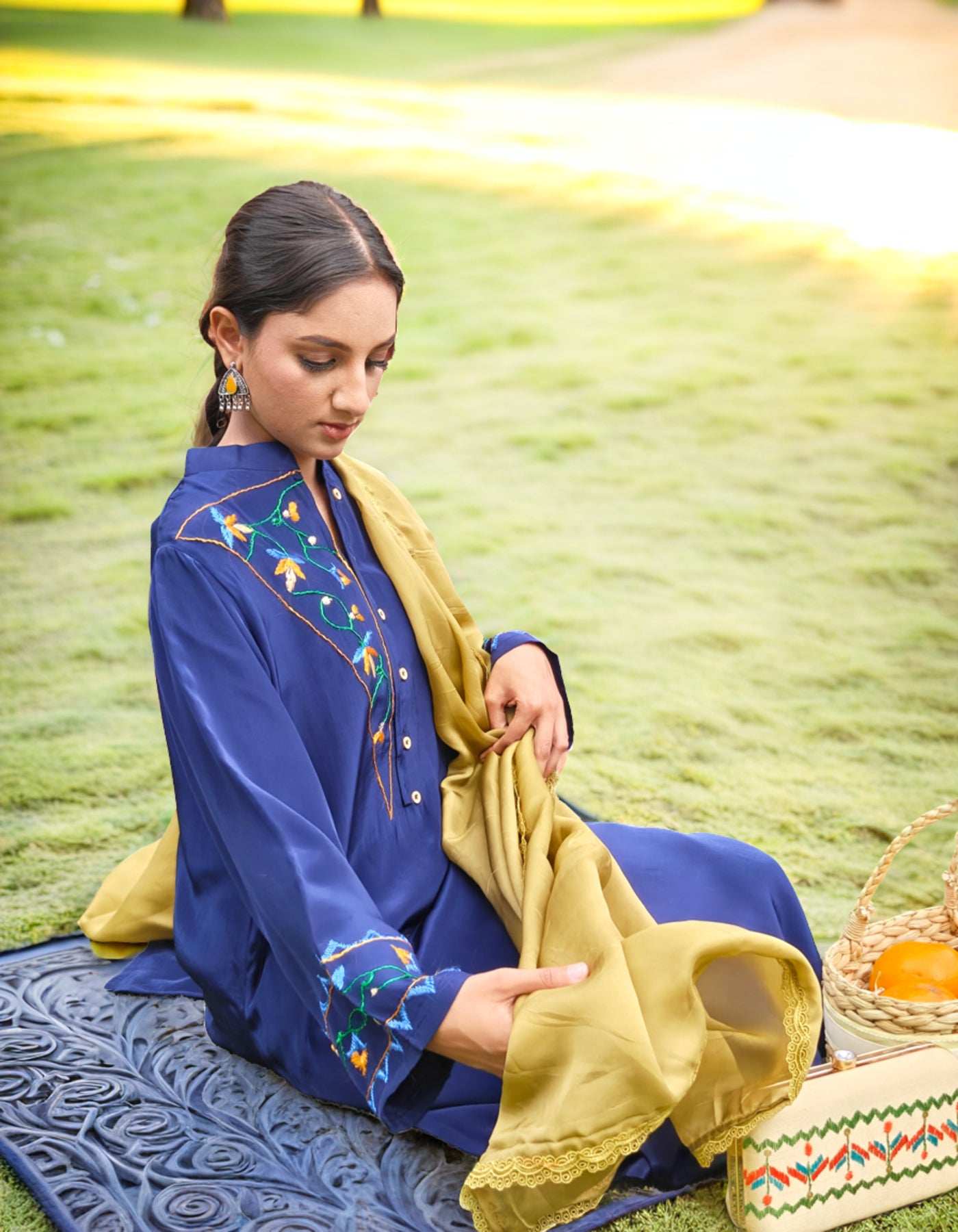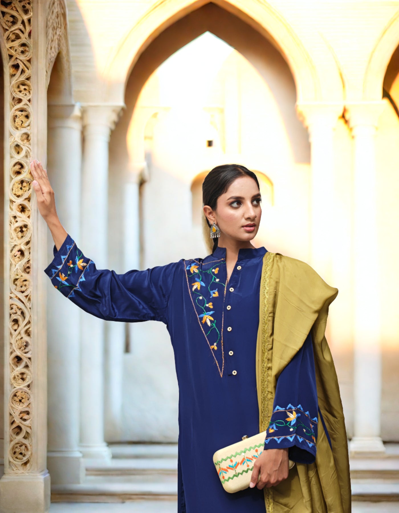 Pure Crepe Hand Work Phulkari Kurta - Heritage Navy Blue
