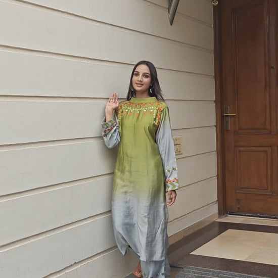 Pure Muslin Hand Work Phulkari Kurti Pant Set - Shaded affair