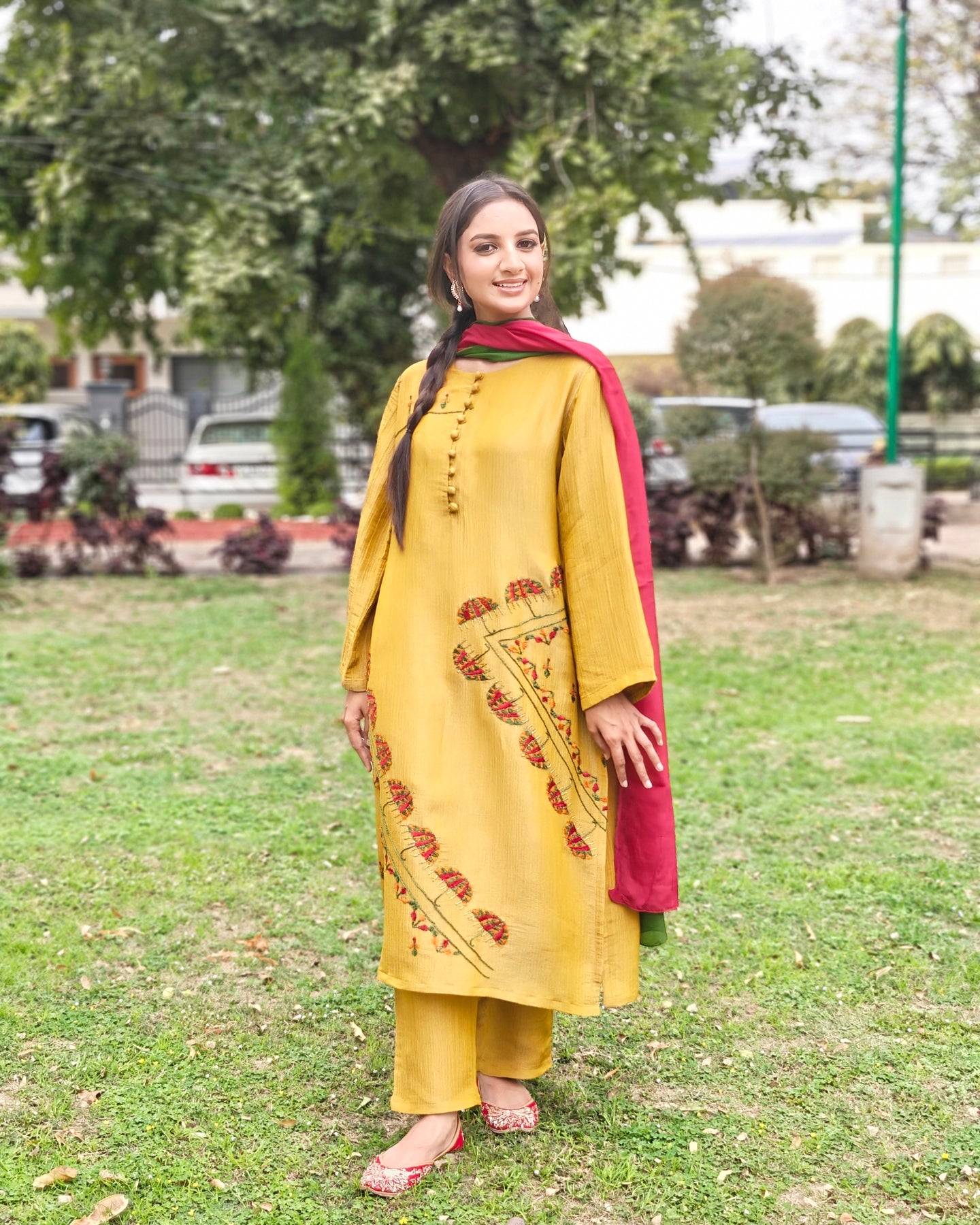 Elevate your style with this exquisitely crafted kurti, where traditional artistry meets modern elegance. Made from luxurious crush tissue fabric, this kurti features intricate Phulkari hand embroidery in a unique pattern, blending rich heritage with contemporary design. The delicate texture of the fabric enhances the embroidery’s vibrant hues, creating a striking yet refined look. Thoughtfully designed for the modern woman, this kurti offers a tailored fit with a graceful flow, making it a perfect choice for both festive occasions and casual elegance.This kurti showcases beautifully crafted umbrella embroidery motifs in vibrant colors, adding a playful yet elegant touch to the design. The rich hues of the embroidery contrast beautifully against the soft fabric, creating a striking visual appeal. The intricate detailing reflects skilled craftsmanship, making this kurti a perfect blend of traditional charm and modern style.